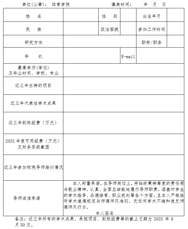 1、各位导师于6月18日前完成提交2025年体育专硕导师招生资格审核表及结果汇总表(纸质签字盖章和电子档)、科研及经费证明材料(电子档),交天游线路测速登录中心研工办进行汇总。